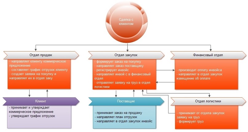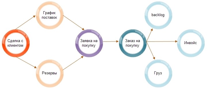 Также стоит отметить, что для каждого сотрудника, участвующего в процессе, необходимо обеспечить максимальный комфорт при работе с данными. Использование системы не принесет должного эффекта, если пользователь будет вынужден постоянно обращаться к большому количеству списков и окон. Вся информация должна быть доступна из одного окна. Для продавца – это сделка с клиентом. В ней ему необходимо предоставить инструмент для создания графика поставки, заявки на покупку, отслеживания этой заявки в заказах на покупку.