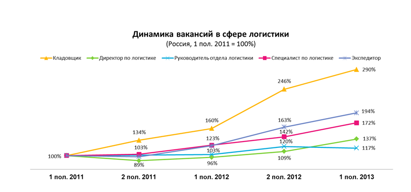 Наивысший прирост вакансий был замечен на должность кладовщика: данных специалистов сейчас требуется в три раза больше, чем в 2011 году. Количество вакансий экспедиторов и специалистов по логистике за последние два года выросло на 94 % и 72 % соответственно. Меньше всего прирост был зафиксирован на позиции директора по логистике (+37 % по отношению к 2011 году) и руководителя отдела логистики (+17 %).